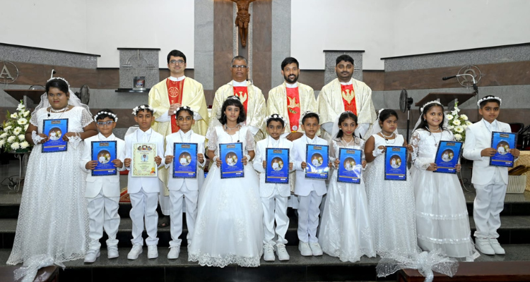 at the 9:15 AM Mass, the First Holy Communion was solemnly celebrated for 11 children in the presence of their parents and four priests. Fr. Charles Menezes was the main celebrant and delivered an inspiring homily to the children.